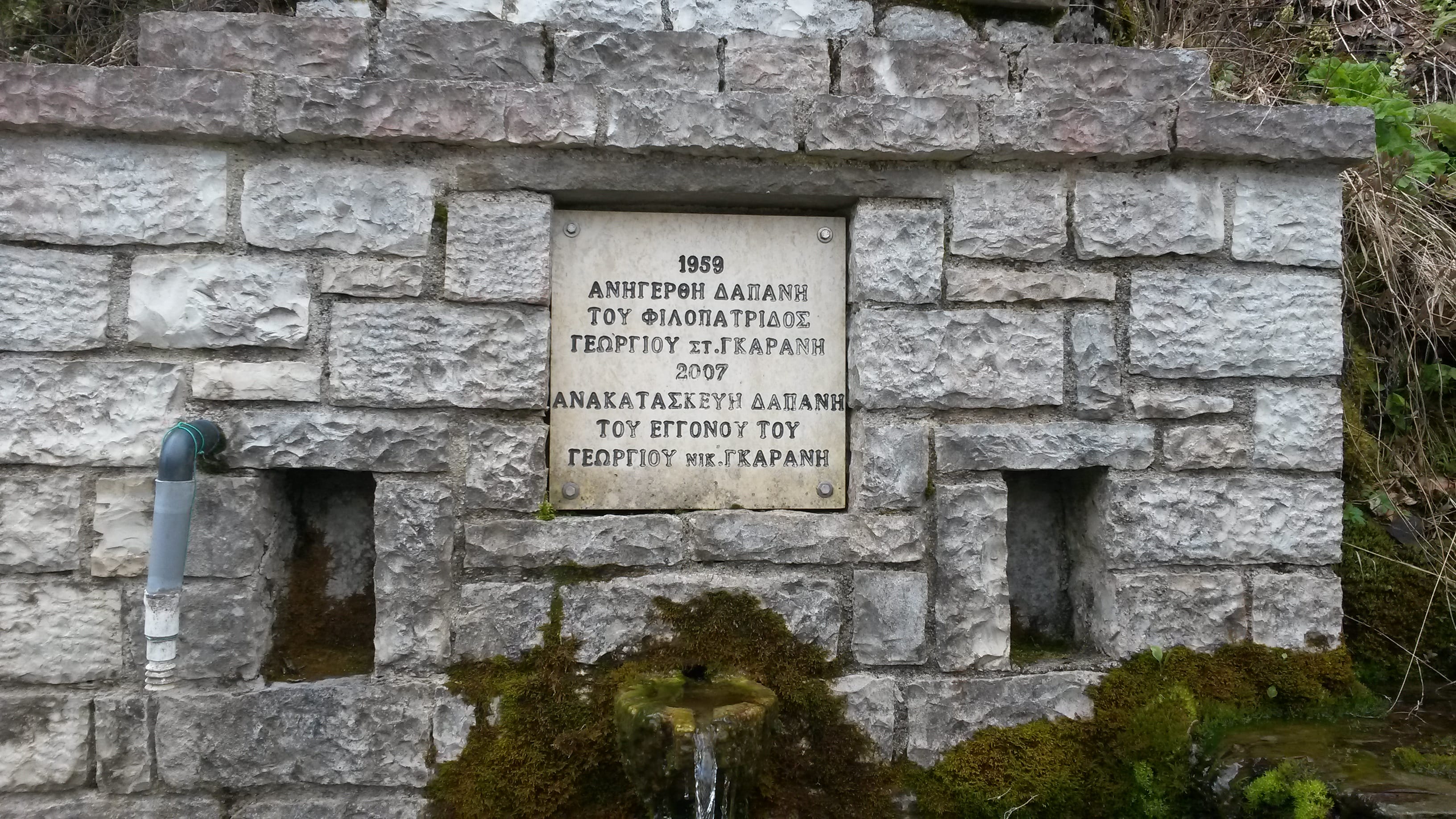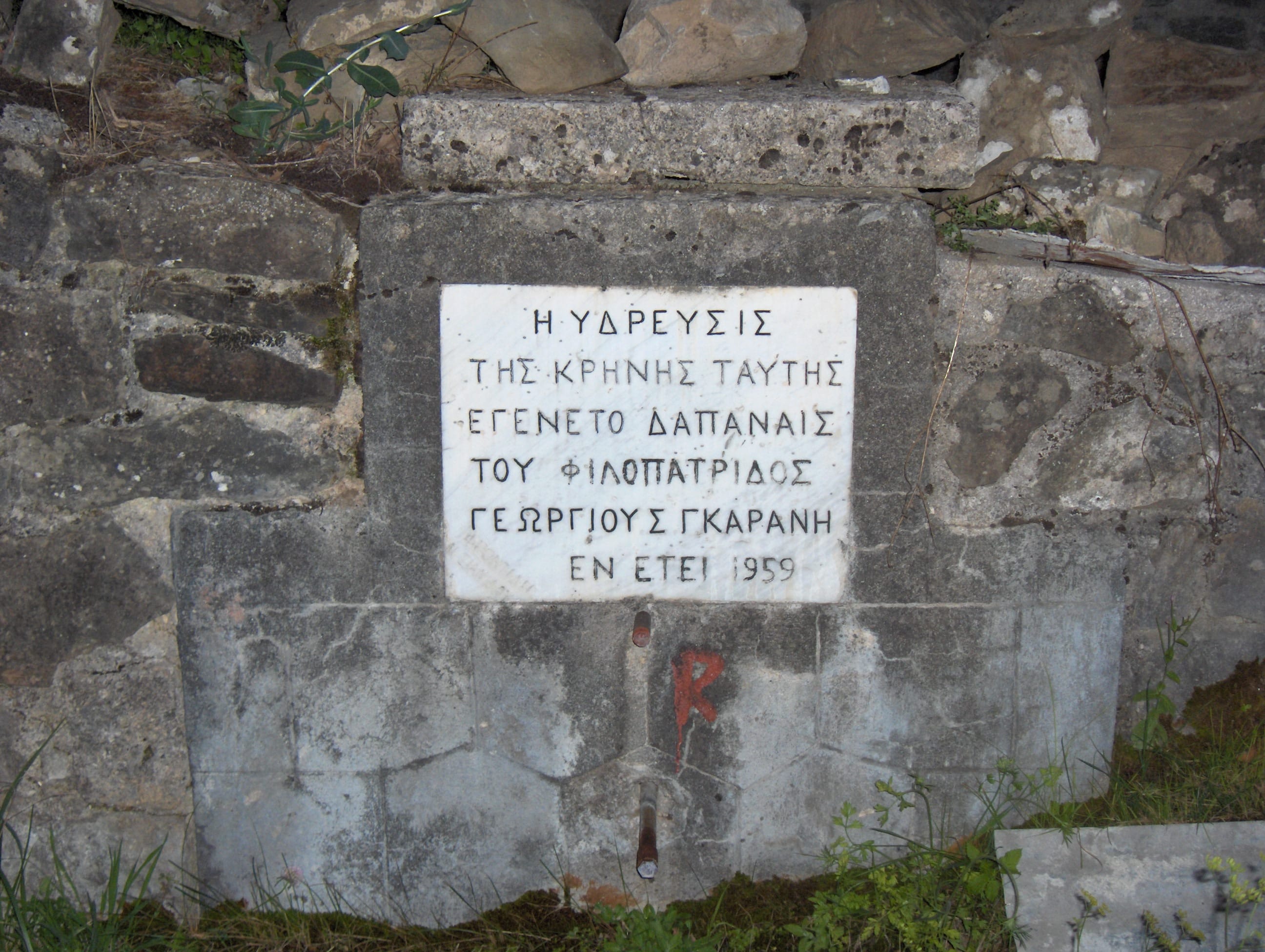 Ἡ ὕδρευσις τῆς κρήνης ταύτης ἐγένετο δαπάναις τοῦ φιλοπάτριδος Γεωργίου Σ. Γκαράνη ἐν ἔτει 1959. — Βρυσοχώρι