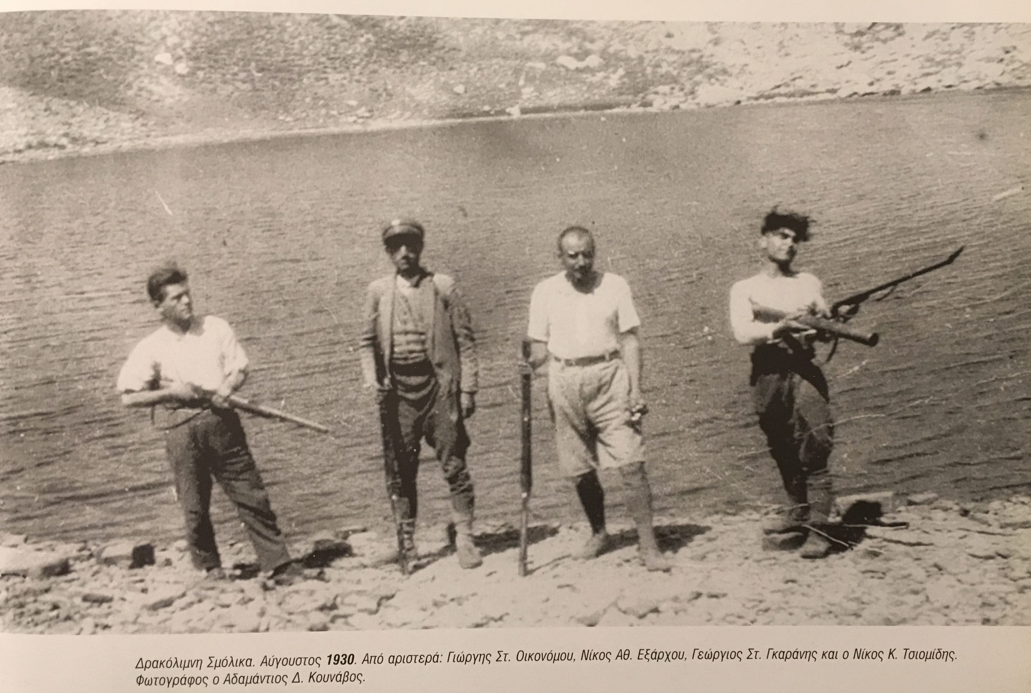 Δρακόλιμνη Σμόλικα. Αύγουστος 1930. Από αριστερά: Γιώργης Στ. Οικονόμου, Νίκος Αθ. Εξάρχου, Γεώργιος Στ. Γκαράνης και ο Νίκος Κ. Τσιομίδης. Φωτογράφος ο Αδαμάντιος Δ. Κουνάβος. — Πηγή Α, σελίδα 233.