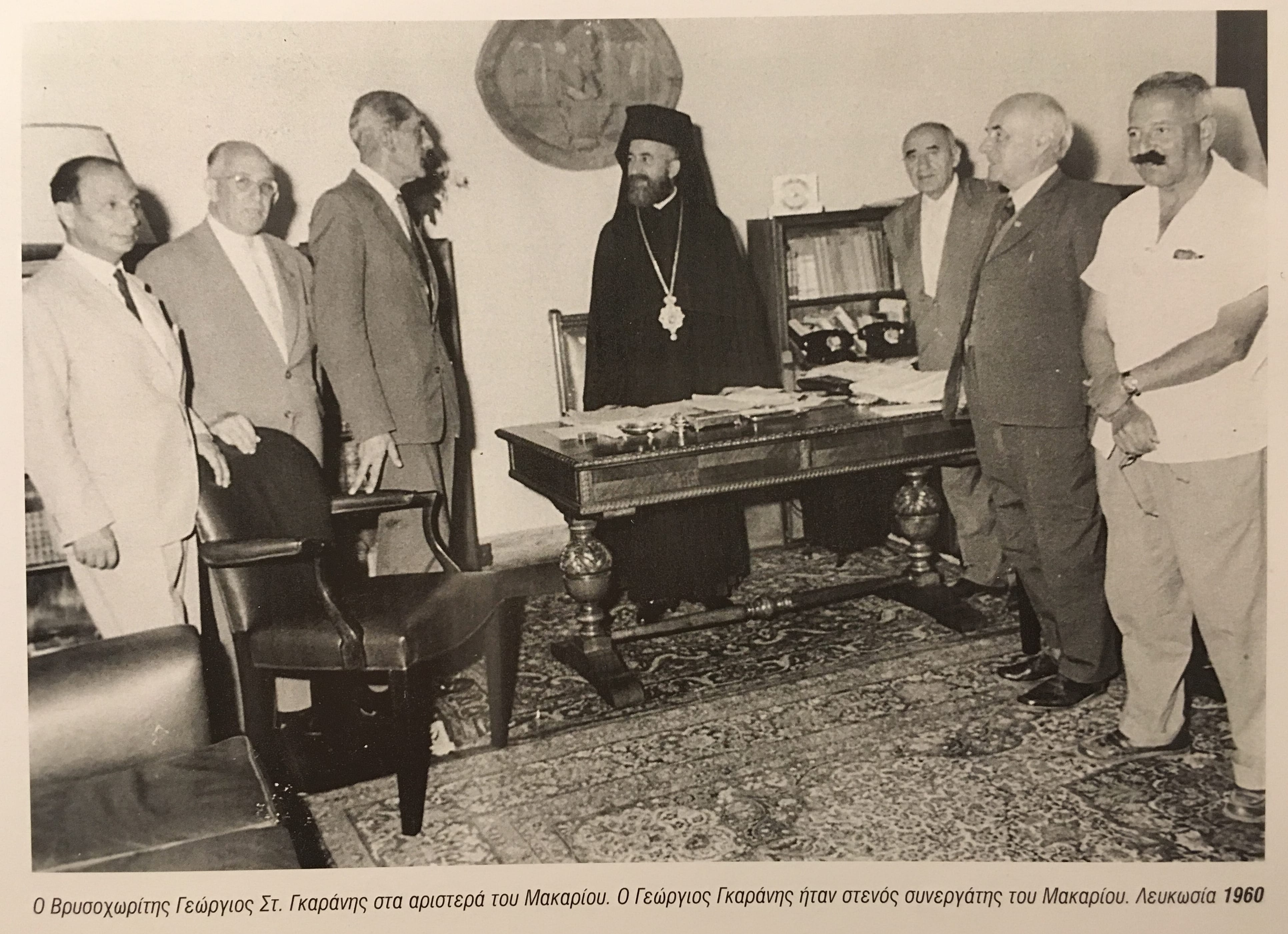 Ο Βρυσοχωρίτης Γεώργιος Στ. Γκαράνης στα αριστερά του Μακαρίου. Ο Γεώργιος Γκαράνης ήταν στενός συνεργάτης του Μακαρίου. Λευκωσία 1960. — Πηγή Α, σελίδα 175.