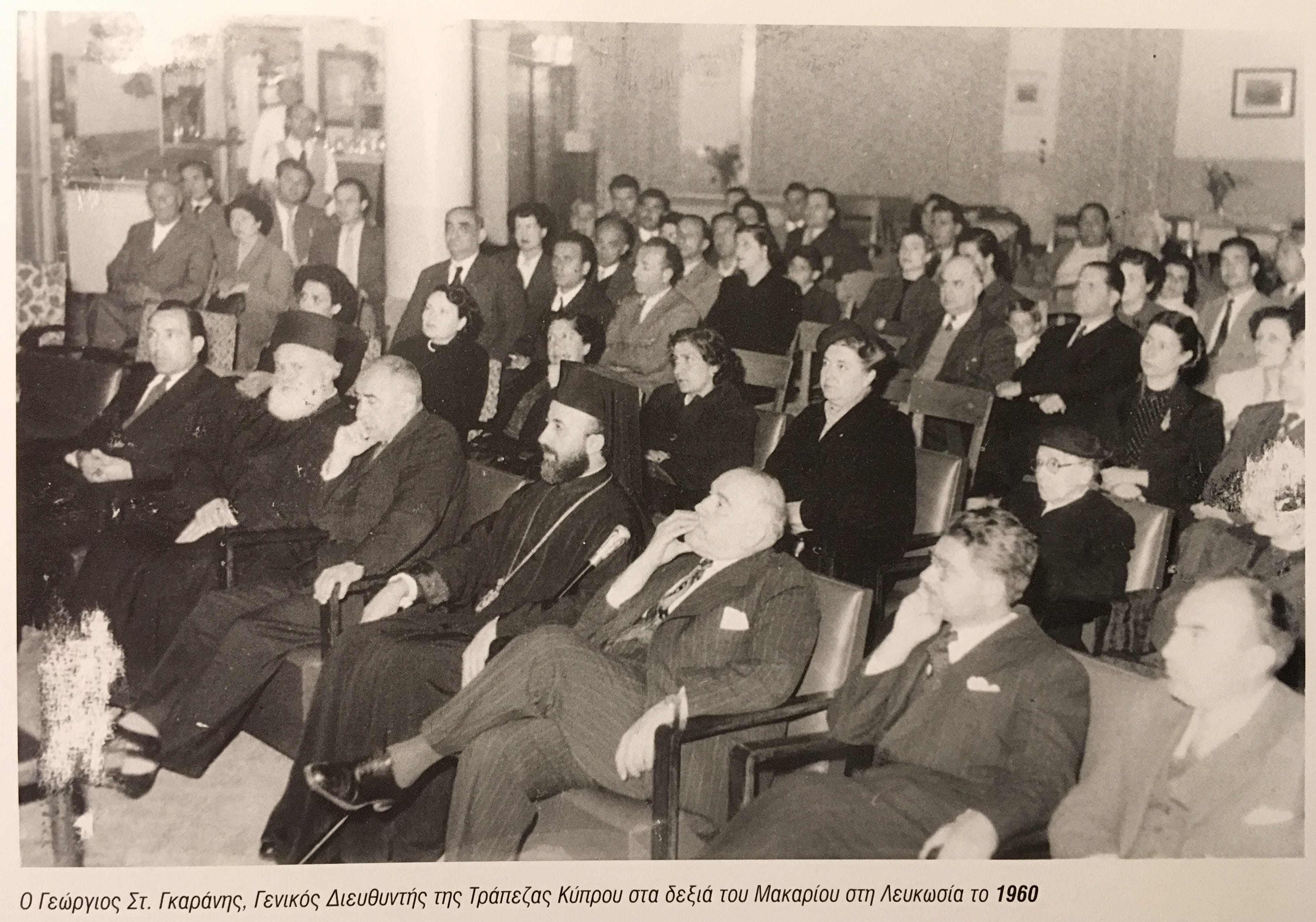 Ο Γεώργιος Στ. Γκαράνης, Γενικός Διευθυντής της Τράπεζας Κύπρου στα δεξιά του Μακαρίου στη Λευκωσία το 1960. — Πηγή Α, σελίδα 175.